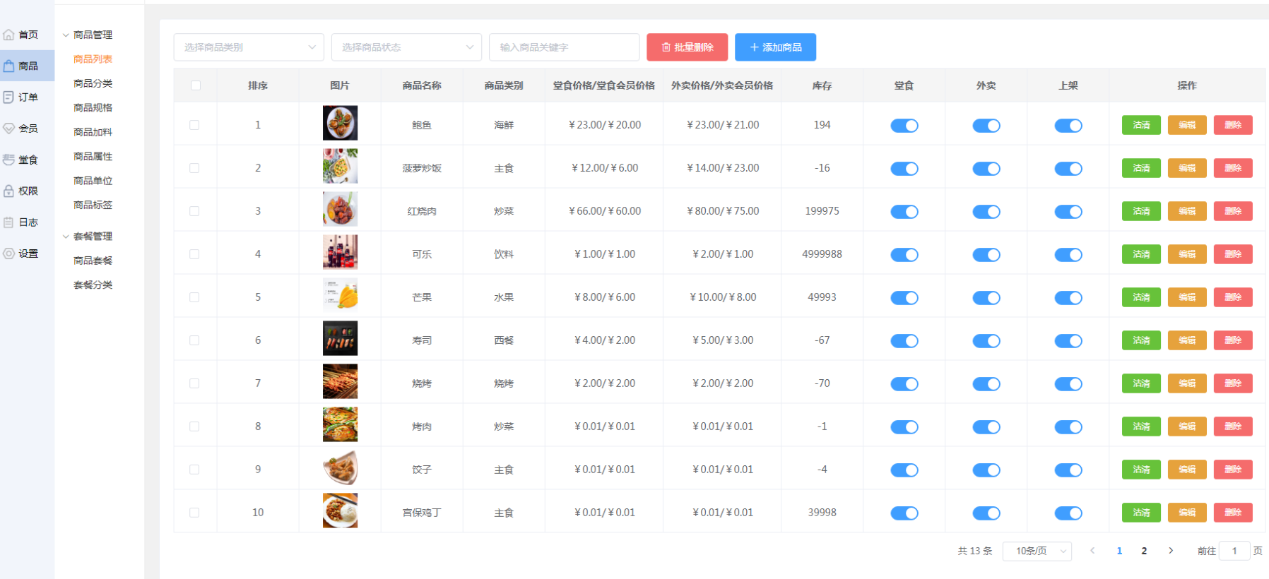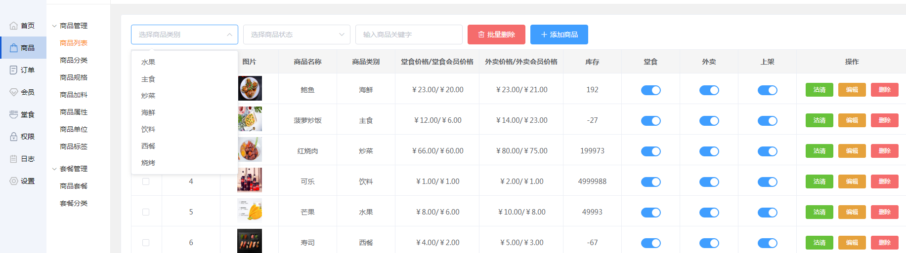 用户可点击列表中的堂食和外卖下的按钮,选择这个商品是否在收银台和小程序显示。