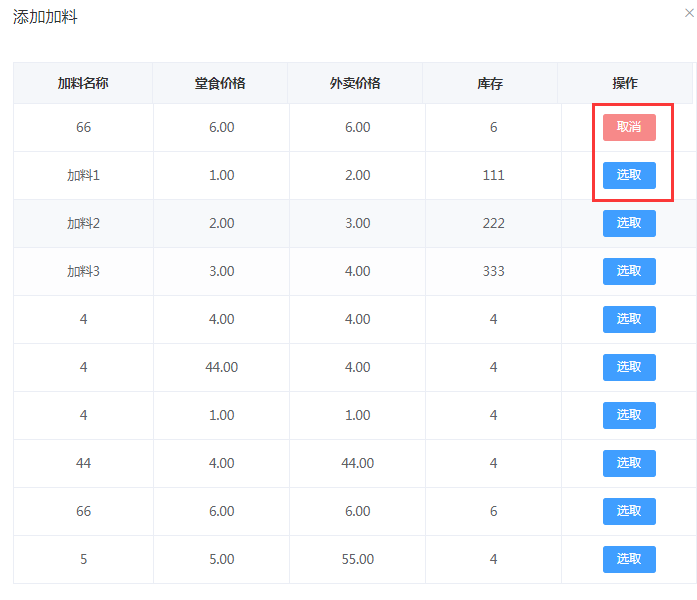 用户可点击【新增加料】,如下图,点击【选取】,选择合适的配料,如果选择错误,可点击【取消】,取消这个选择。
