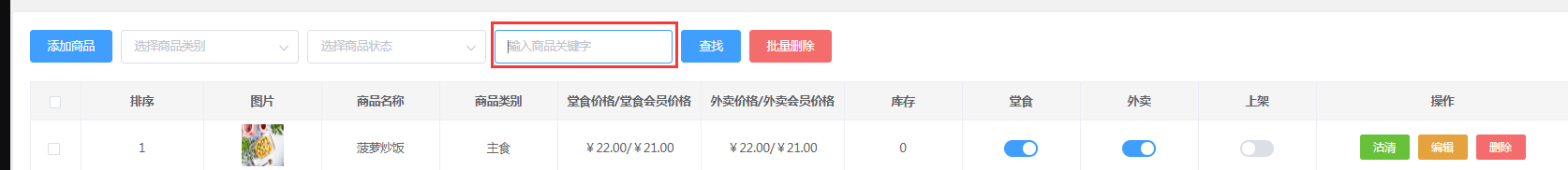 商家可输入商品名称中的携带字(例如:菠萝炒饭,输入饭,会显示所有携带饭字的商品)查找商品。