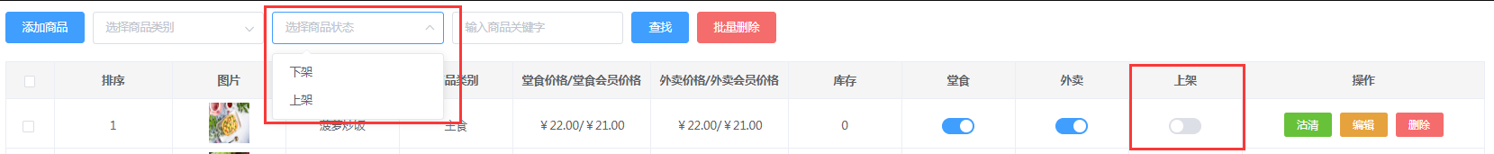 用户可在上架栏点击按钮,根据需要修改商品的上架下架情况,之后可通过选择商品状态点击查找,查看上架下架的商品。