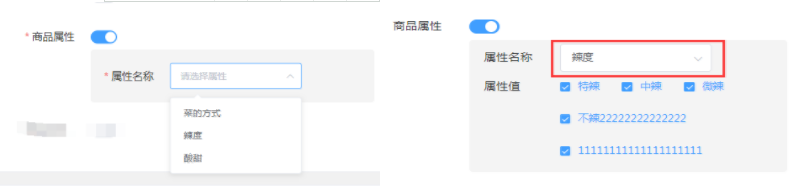 用户可点击属性名称下的【请选择】,选择一个属性,会出现对应的属性值(可多选),如果不需要则关闭商品属性的按钮即可。