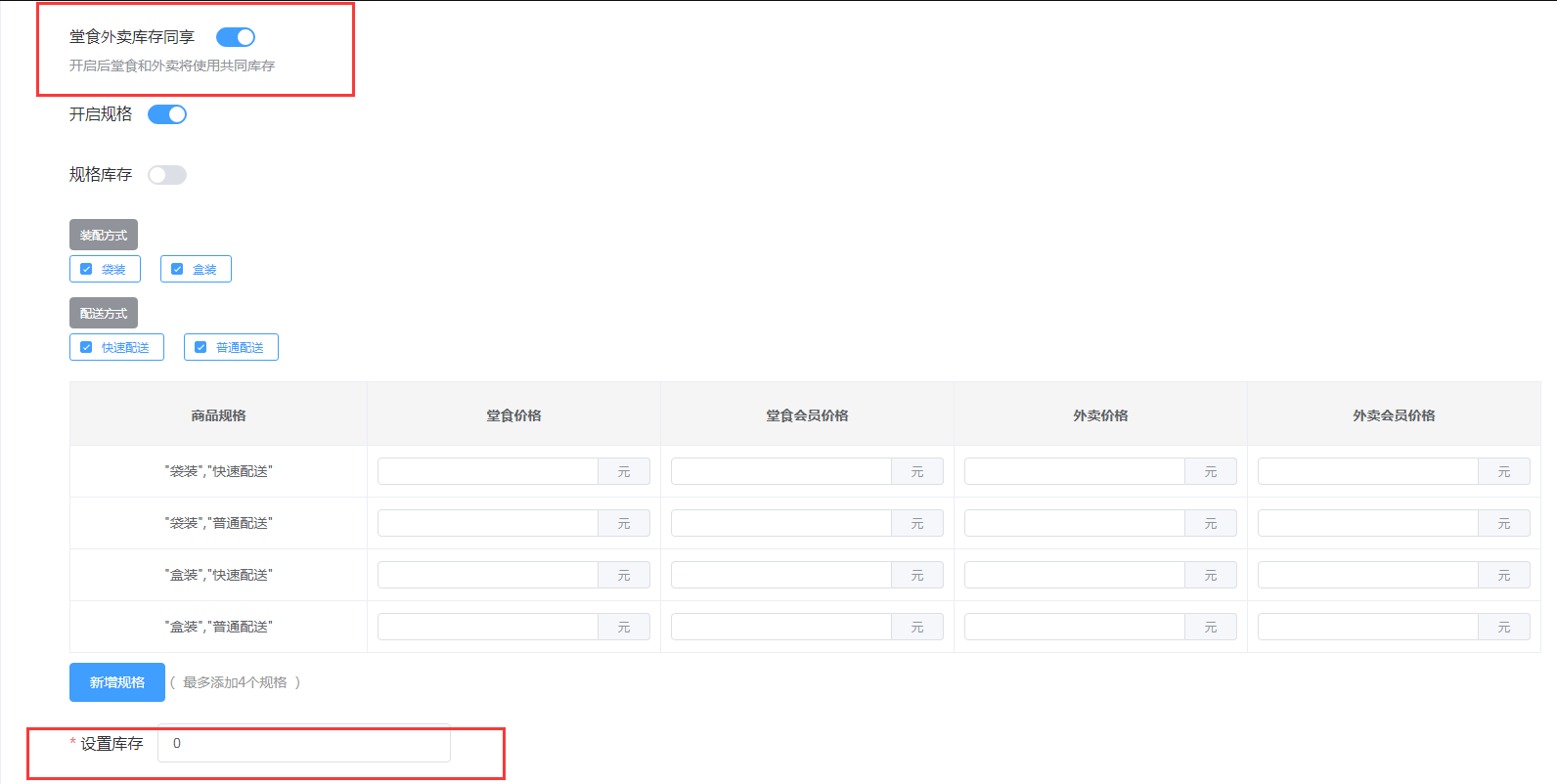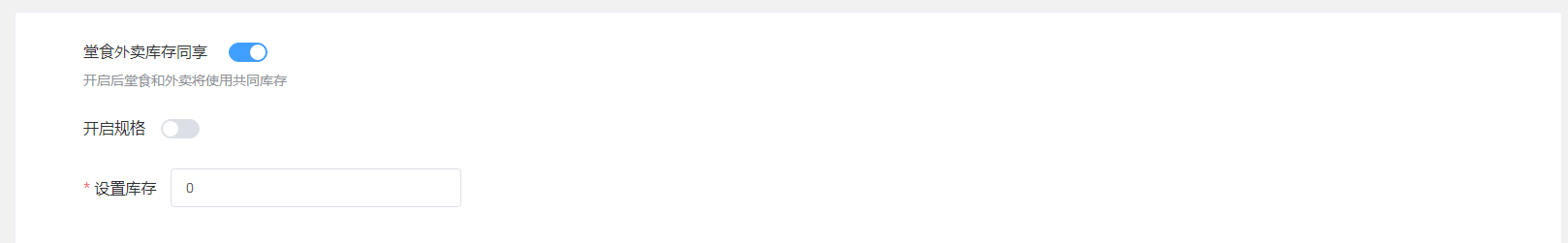 当【堂食外卖库存同享】和【开启规格】开启时,下方的设置库存,设置的就是共有的库存,不区分外卖堂食以及规格。