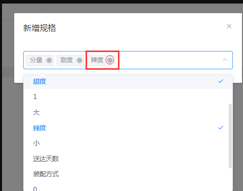商家在选择堂食与外卖库存共享时,开启规格和规格库存,点击【新增规格】,可选择需要的商品规格。我们可以点击选择好的规格的【×】,将多选的规格删除。(温馨提示,注意规格最多只能选择4个)