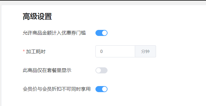当只开启【堂食外卖库存同享】时,我们需要在这设置共有库存,在下面设置堂食和外卖的会员价格和非会员价格(可不输入会员价)(可选择是否开启堂食或外卖,最少选择一个)。