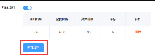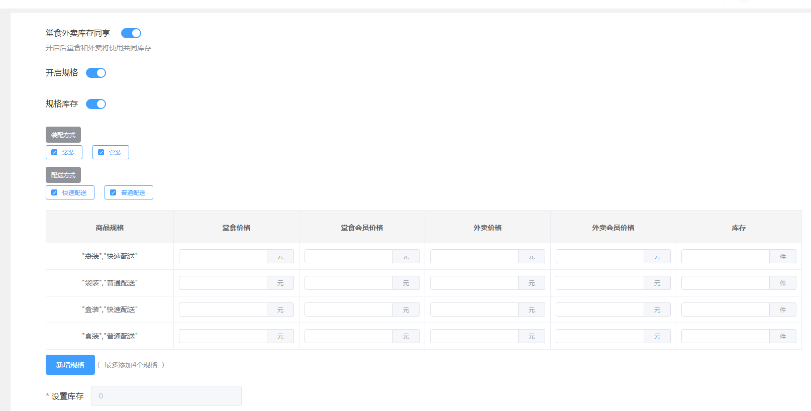 当只有【开启规格】是开启状态时,我们注意下方填写堂食库存和外卖库存。(此库存是共有的库存,不会区分不同规格下的不同库存。)
