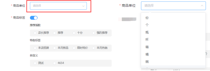用户可在如图所示图框中选择对应的商品单位。(如果没有合适的单位名称可到商品管理下的商品单位中添加)