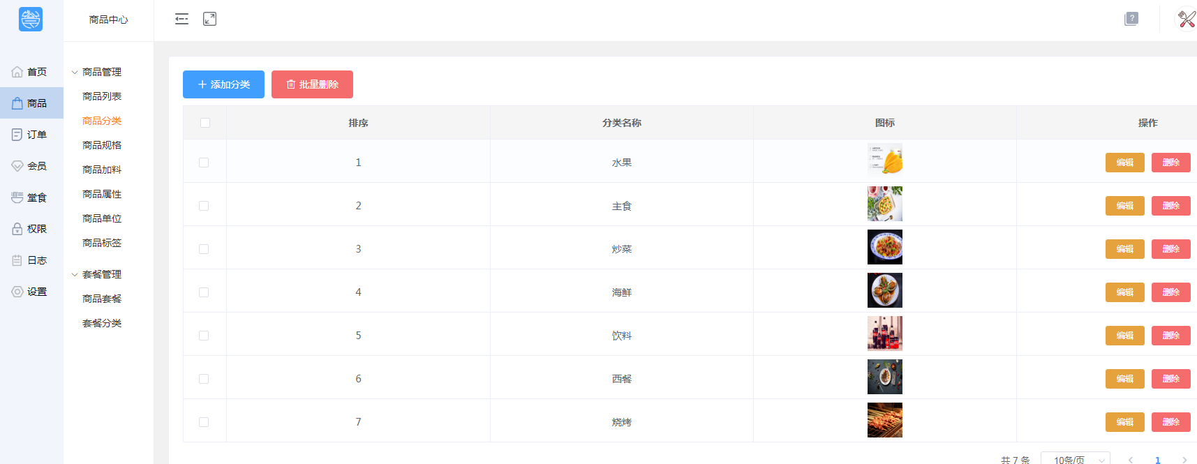 商家在进入商品分类页面后可点击【添加分类】,填写序号,分类名称,还有实物图,创建商品的种类。分类图标会在小程序端展示。