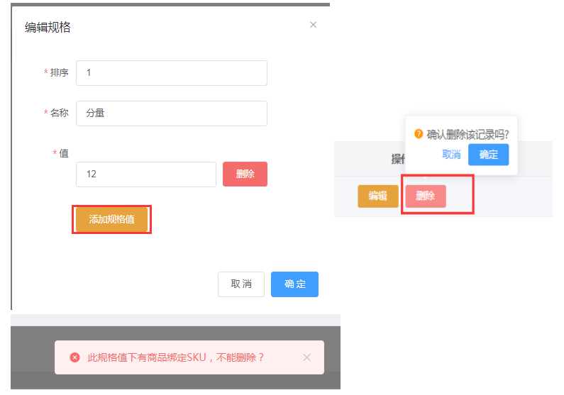 当信息填写错误时,我们点击【编辑】,根据弹框修改(添加规格值和删除一样使用)。