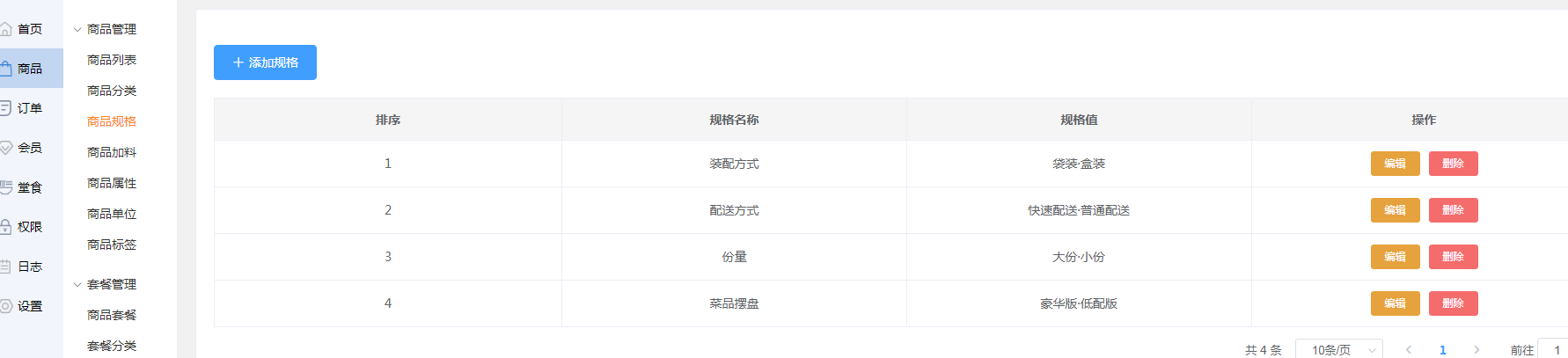 如果商家不想要这个规格信息,可点击操作栏中的【删除】,删除这条记录(但是要先点击编辑把规格值删除)。