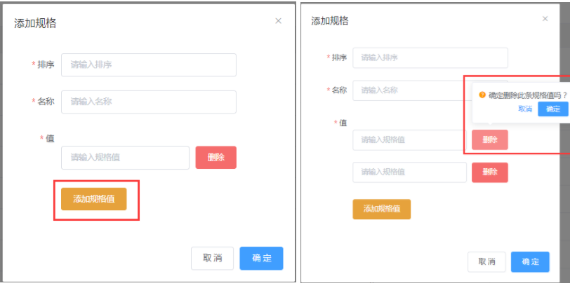 当规格值过多时,我们可以点击【删除】【确定】,将多余的规格值删除(必须把规格值内容删除才能删除规格值)。