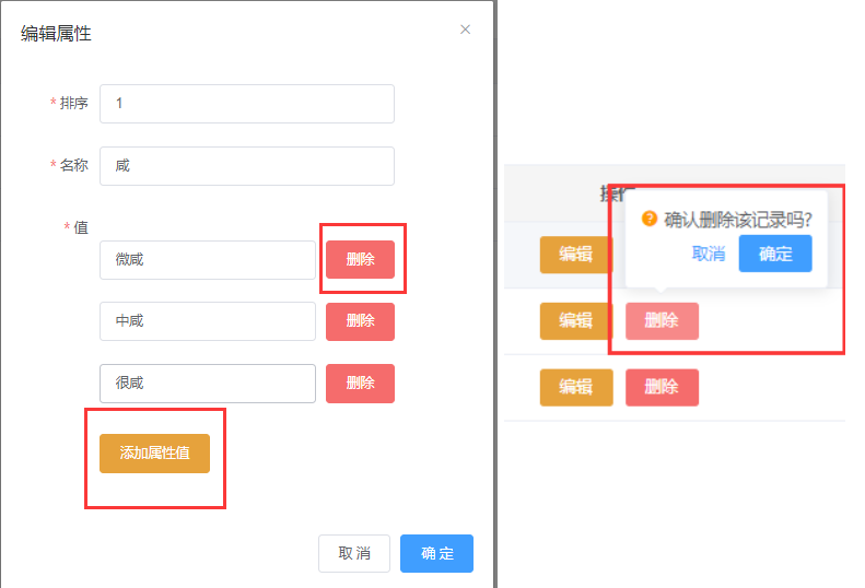 当信息填写错误时,我们点击【编辑】,根据弹框修改(添加属性值和删除一样使用)。
