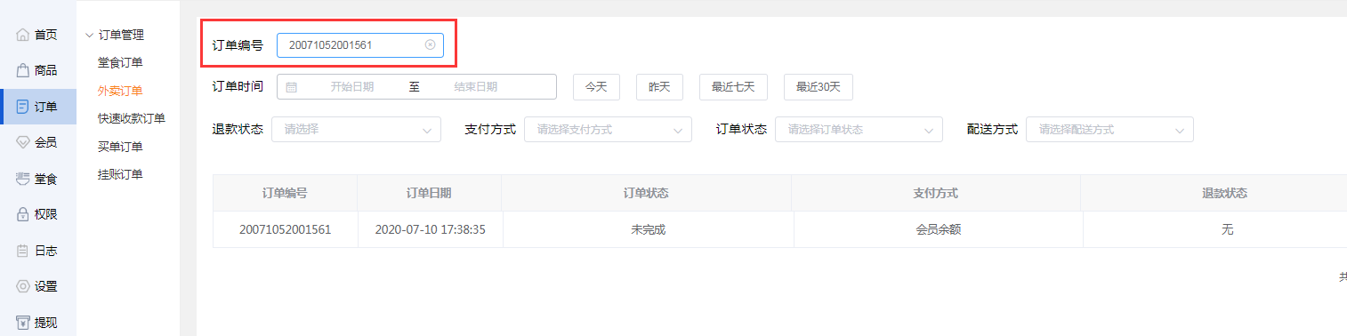 商家可输入订单编号在下列图表中显示出此编号的外卖订单。