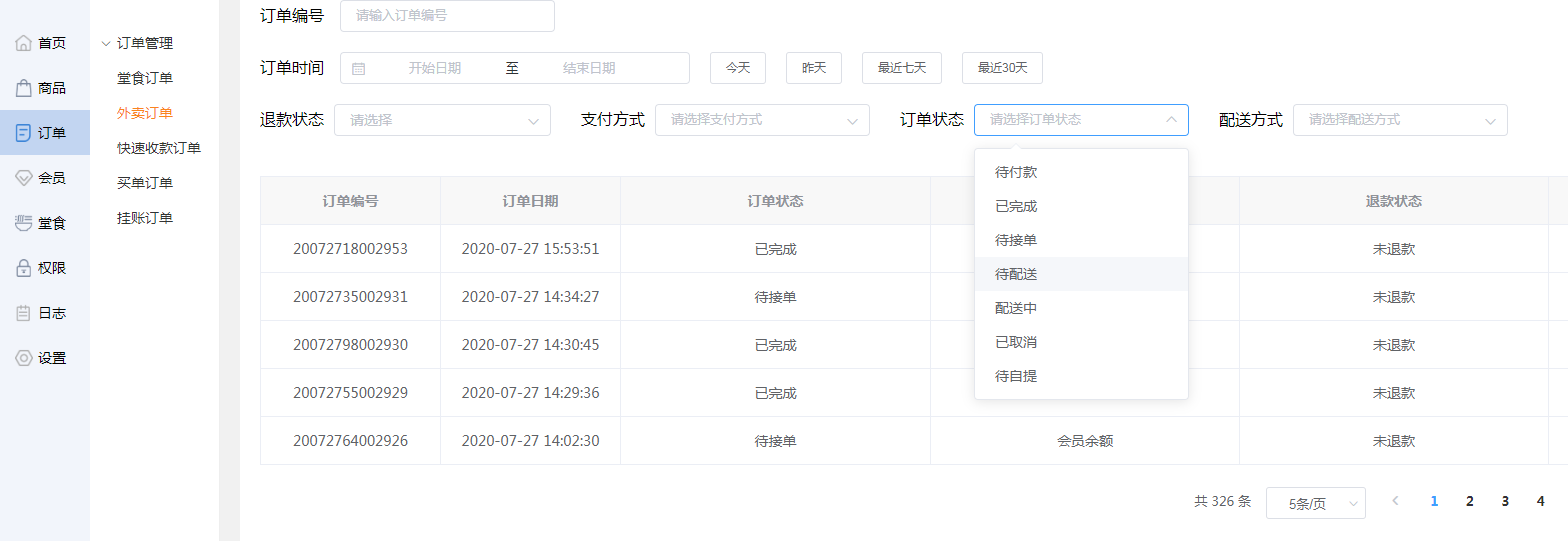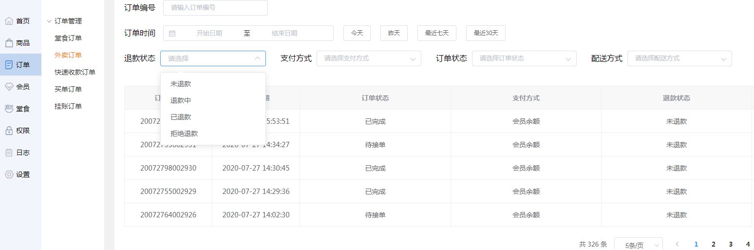 商家可选择退款状态,选择某一状态,查看此退款状态的外卖订单信息。