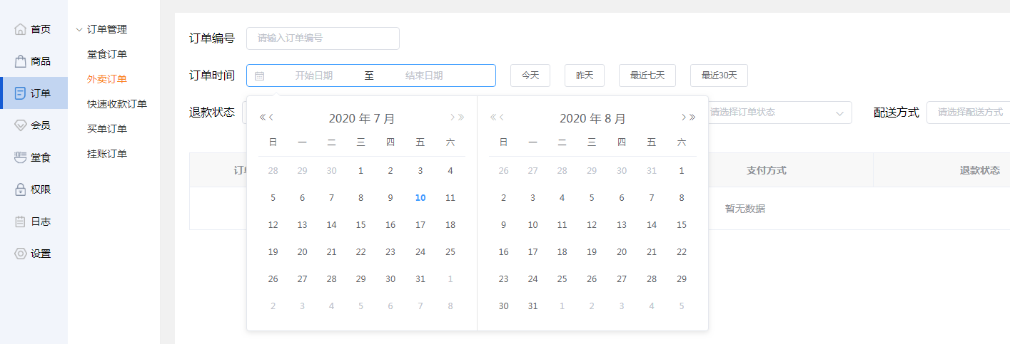 商家可选择开始日期和结束日期,筛选时间段的外卖订单。