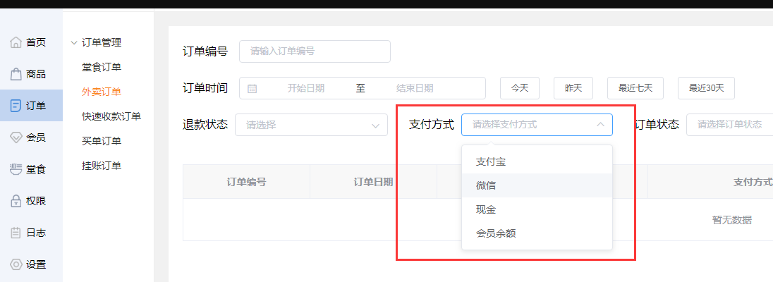 商家可点击【请选择支付方式】,根据弹框选择某个支付方式,图表中就会显示出某支付方式的外卖订单。