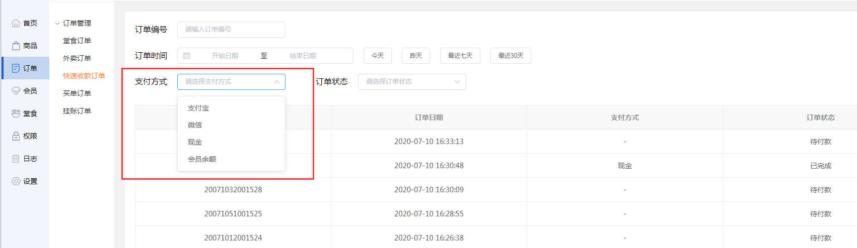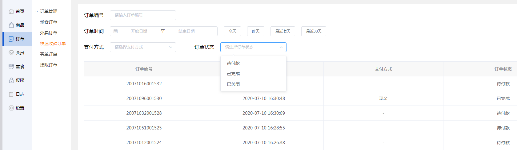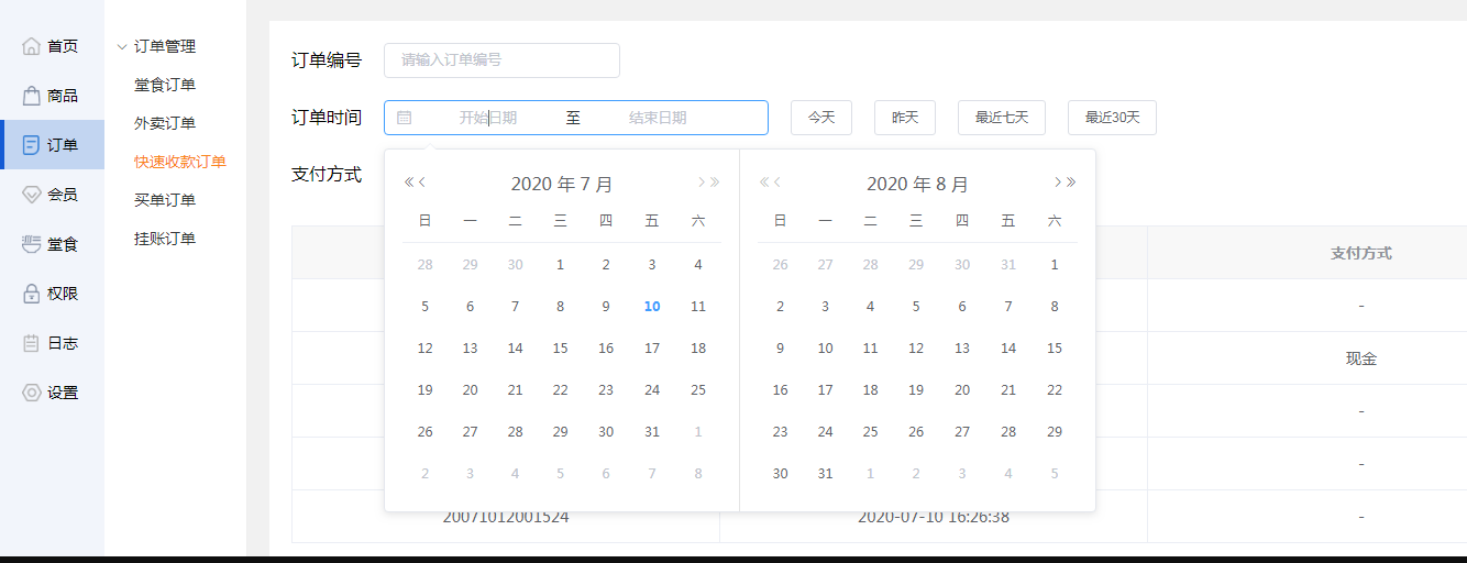 商家可选择开始日期和结束日期,筛选时间段的快速收款订单。