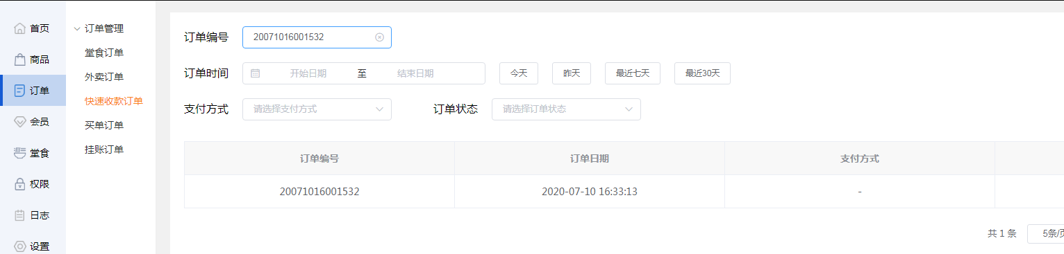 商家可输入订单编号,在下列图表中显示出此编号的快速收款订单。