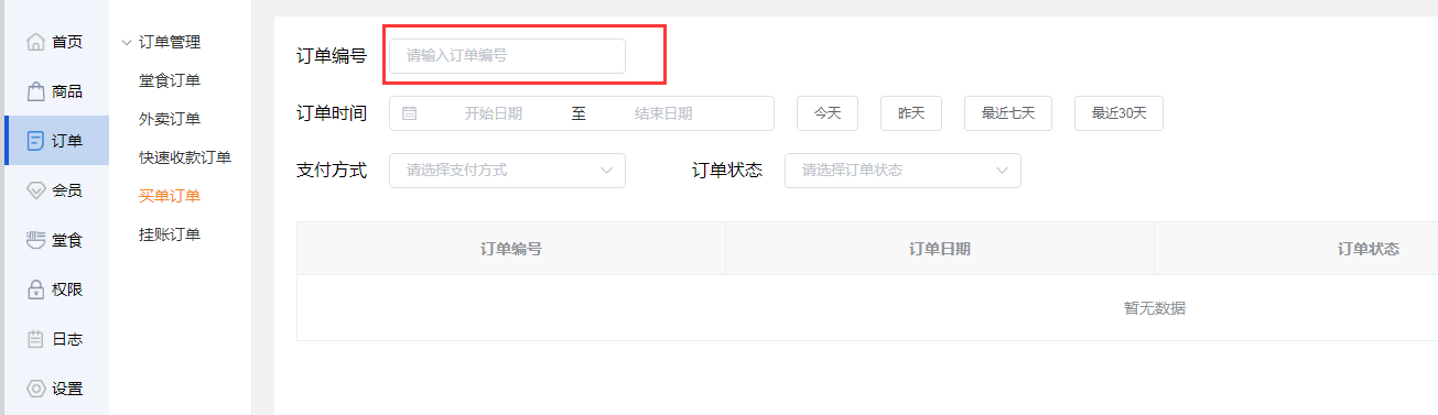 商家可输入订单编号,在下列图表中显示出此编号的买单订单。