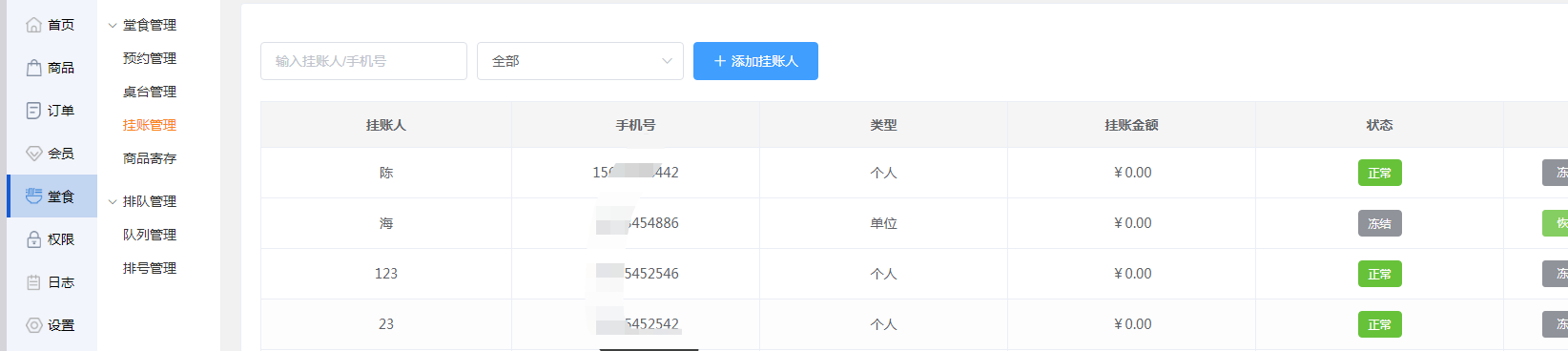 商家可点击操作栏下的【冻结】【恢复】,更改挂账人的状态,选择将齐恢复正常还是将其冻结。