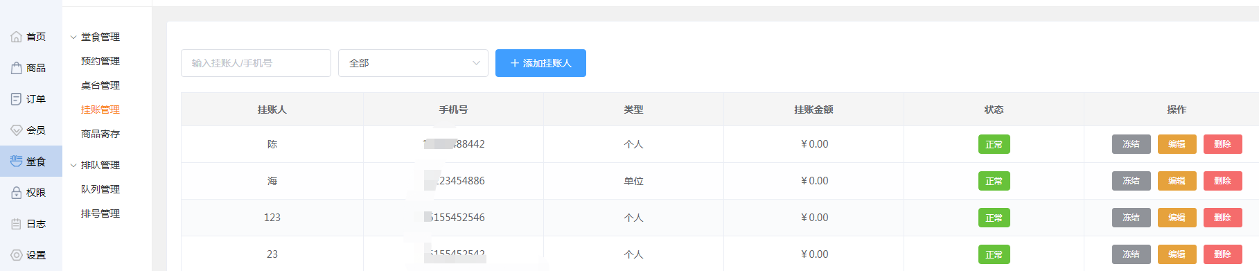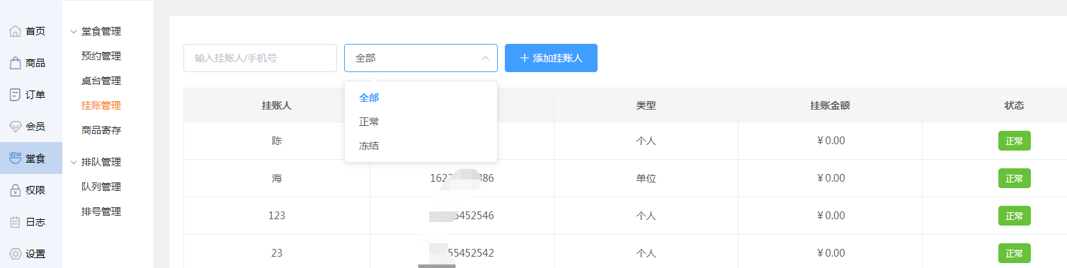 商家可通过“全部、正常、冻结”三种状态,查看此状态下的挂账人信息。