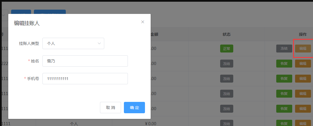 商家在挂账人信息编写错误时可点击【编辑】,修改挂账人信息。