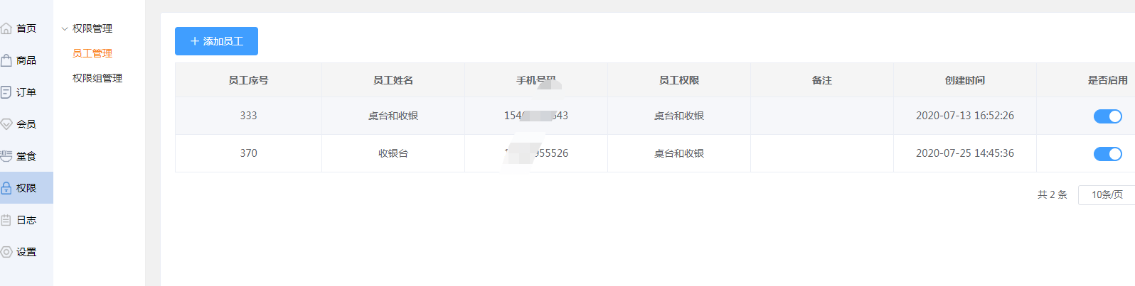 用户可点击【添加员工】,先在权限组管理设置权限后,员工权限下拉框选择对应的权限,添加员工。