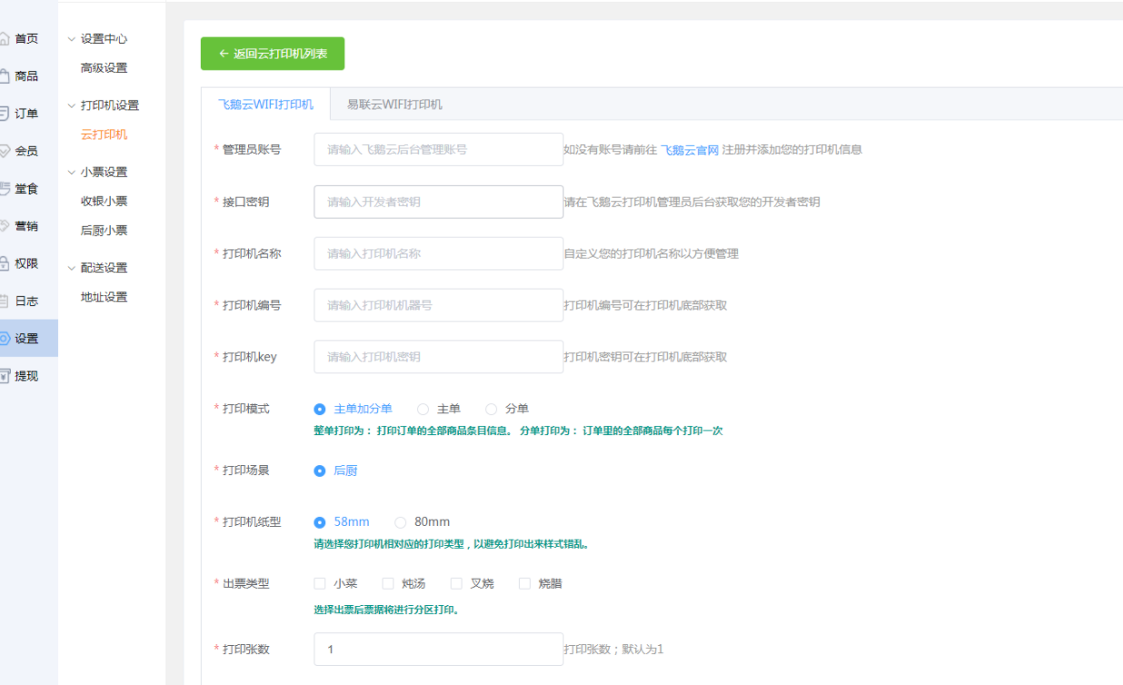 注意打印机类型,有飞鹅云和易联云两种。对应打印机填写。