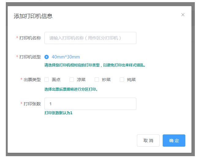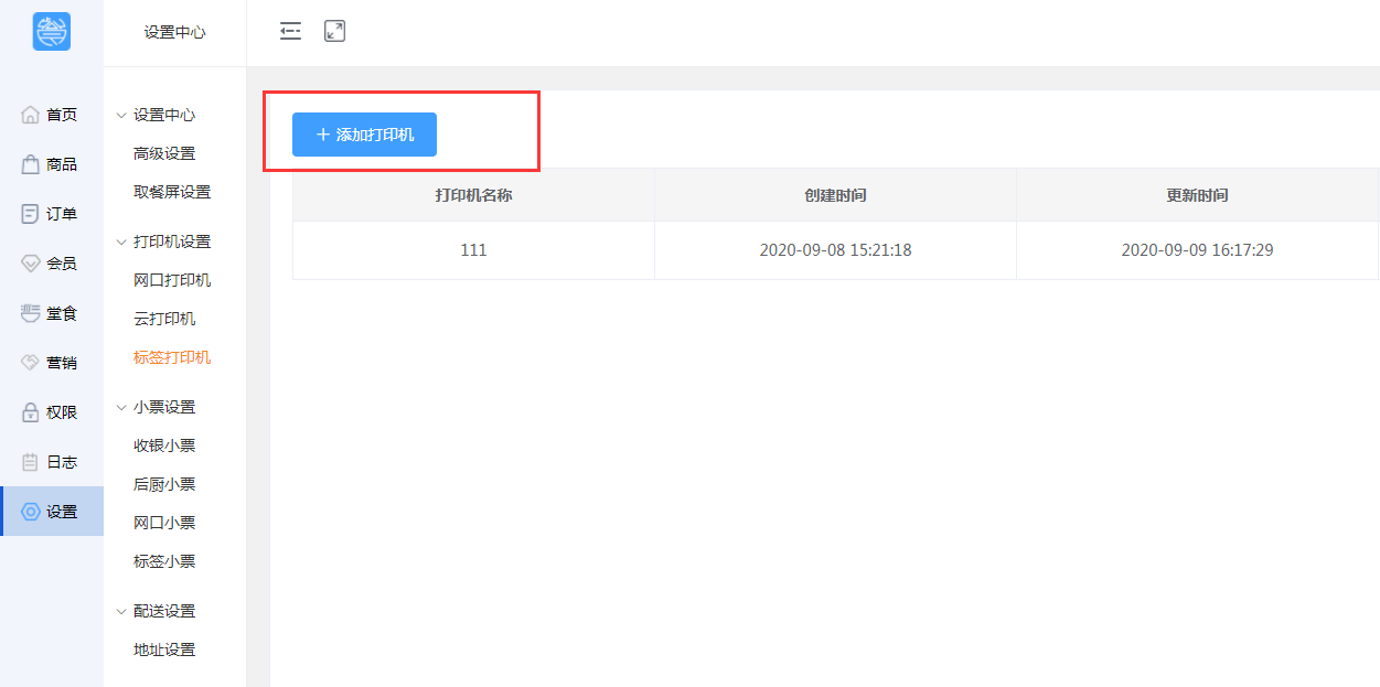 用户点击【添加打印机】,进入页面后添加打印机信息,信息完成后状态开启,在收银端的更多点击标签打印机是可以绑定的