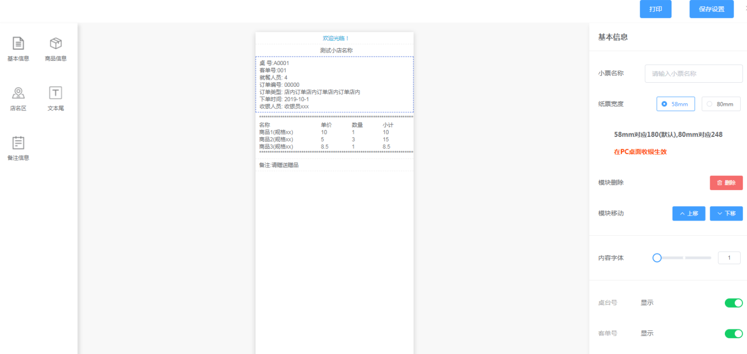 商家在点击【添加飞鹅云小票】【添加易联云小票】后进入下图页面,可点击左侧图框内的信息框,给小票添加合适的内容,详细内容会在中间显示。同时我们可以选择设置纸张宽度,模块删除以及模块移动,头部和内容字体大小的设置。