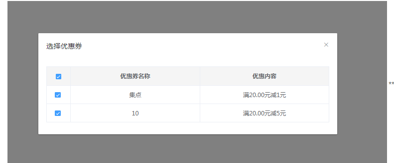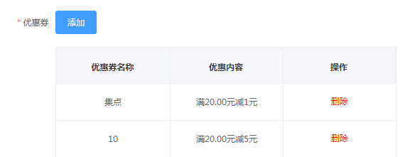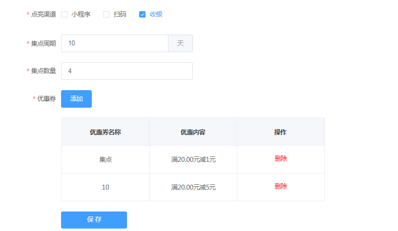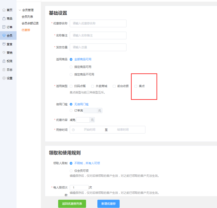 用户可在优惠券中选择集点,设置集点的优惠券,才能在集点活动中点击【添加】后,选择优惠券(扫码,外卖和前台收银的优惠券不会在几点中展示)