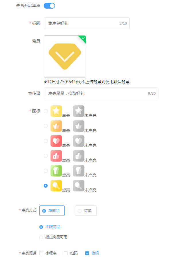 集点数量:指的是小程序端显示的这个,设置为几,客户就要集满多少颗星星才可以点亮成功。