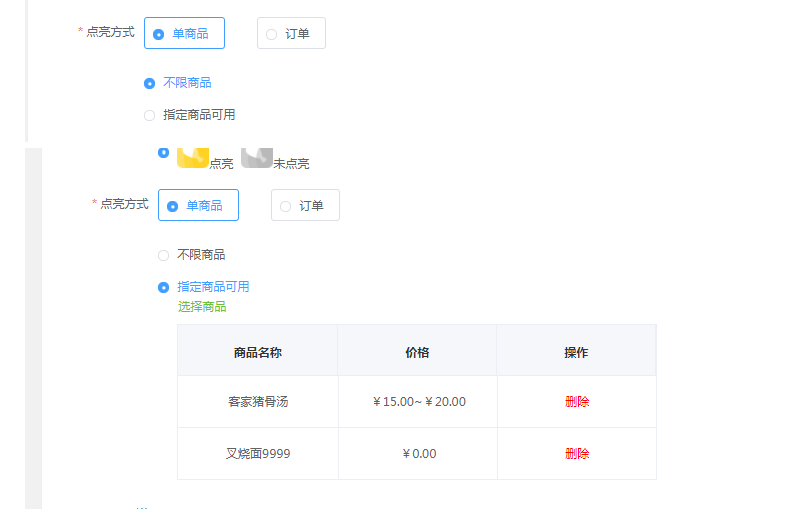 选择指定商品可用时,可点击绿色字体【选择商品】,选择完菜品之后,客户只有下单的时候选择了列表中的菜品才会点亮星星。