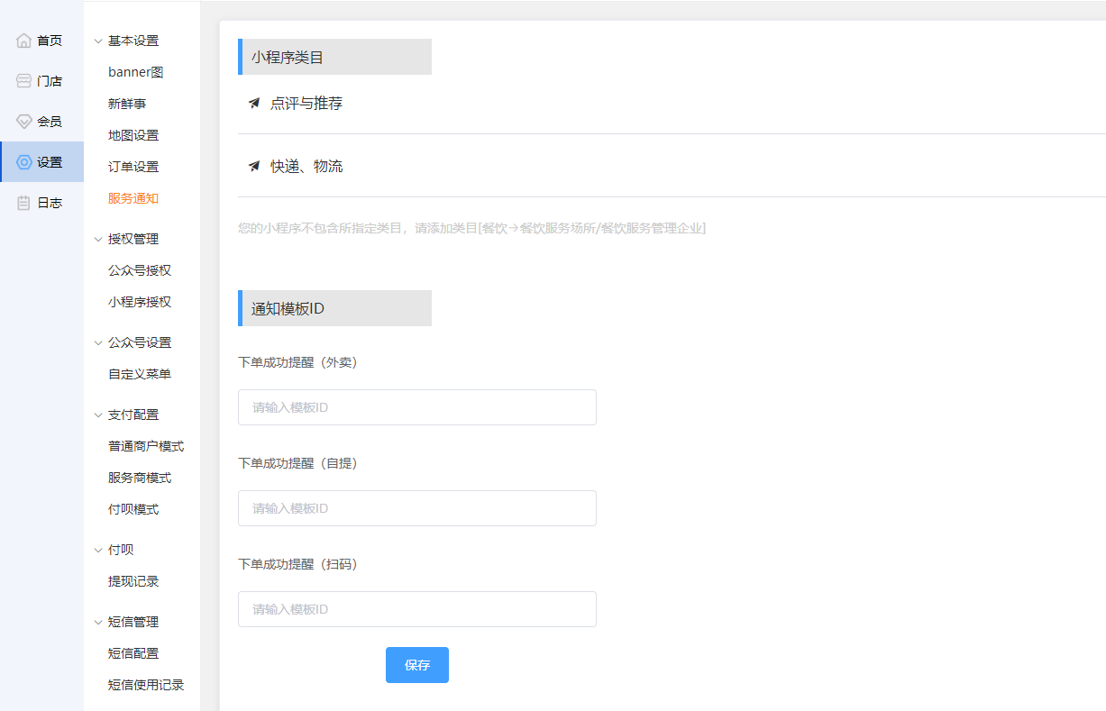 选择如下图所示,三个类目,然后在我的模板页面,复制对应的模板ID粘贴到后台
