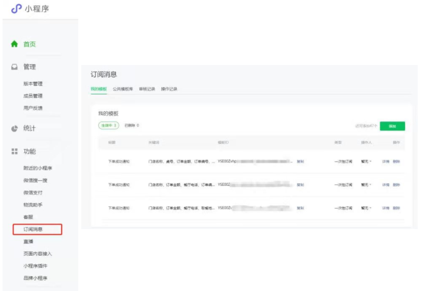 进入页面选择侧边栏订阅消息,进入页面如图2,用户在这里点击添加