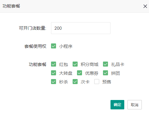 点击功能套餐可以给商户设置营销插件和创建店铺数量