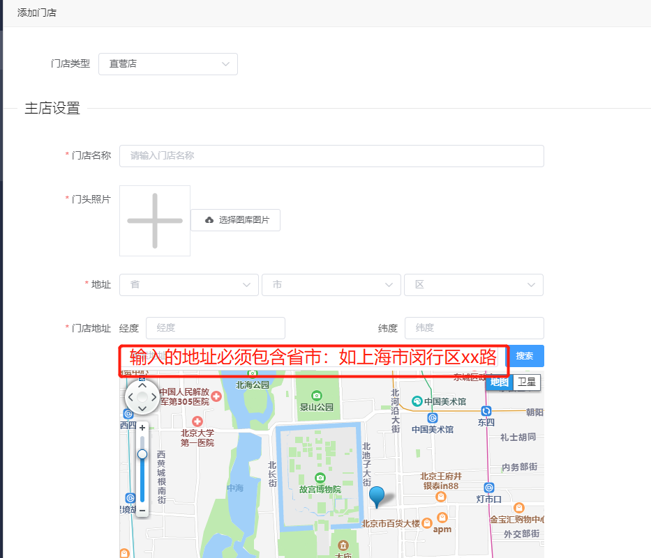 输入门店信息,注意搜索地址的地方需要输入完整的地址省+市+街道