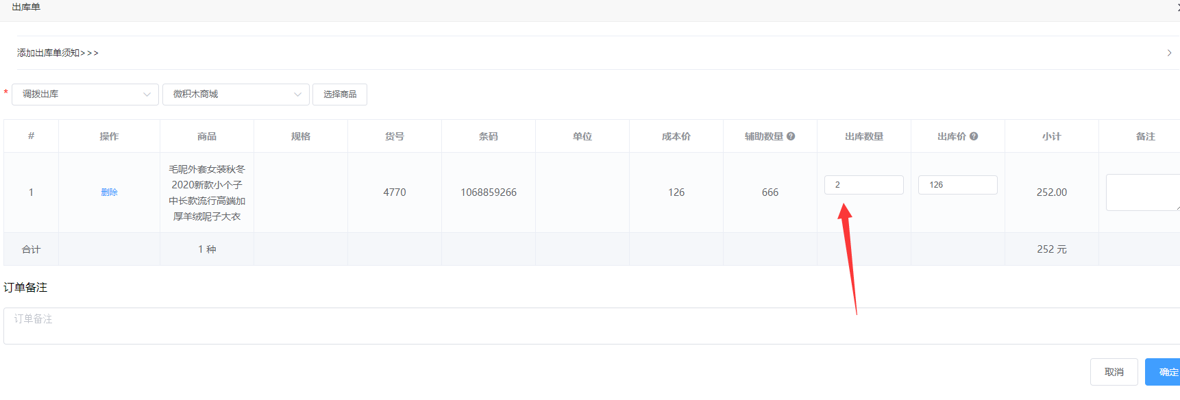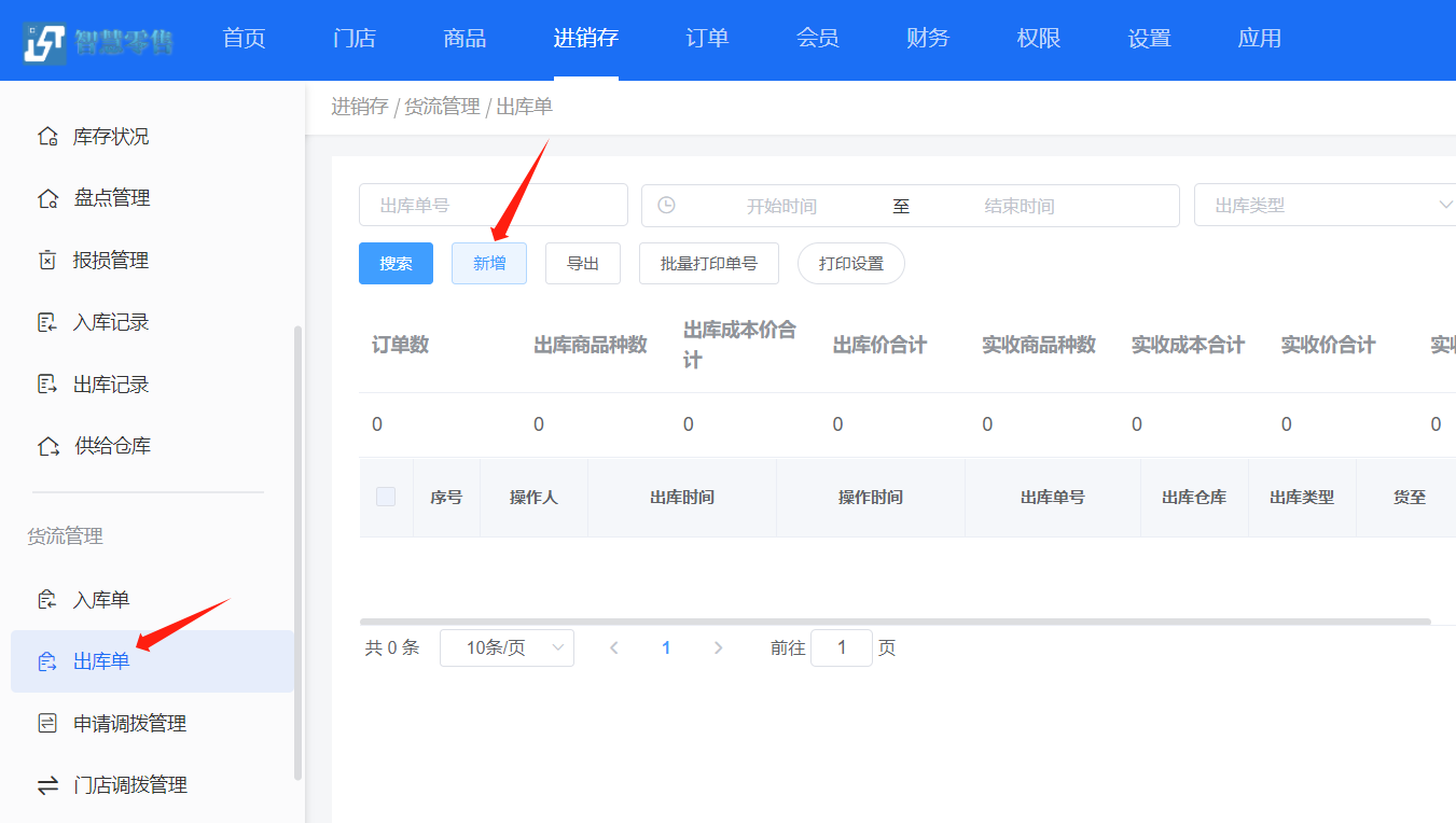 选择出库类型和所属门店,设置出库数量并出库