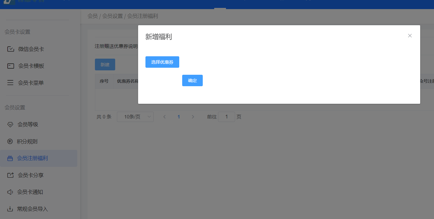 2、点击新会员注册福利设置,可以新增会员注册赠送优惠券,点击新建可以新建优惠券,输入优惠券名称、库存满减,设置完成后,只要新用户注册会员,就会收到推送的优惠券会员能领取设置开启、有库存且没有失效的所有优惠券各一张,公众号注册包括直接公众号注册和小程序内部的注册