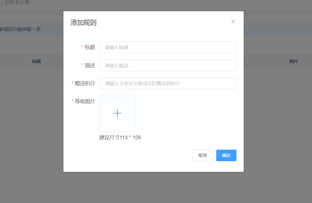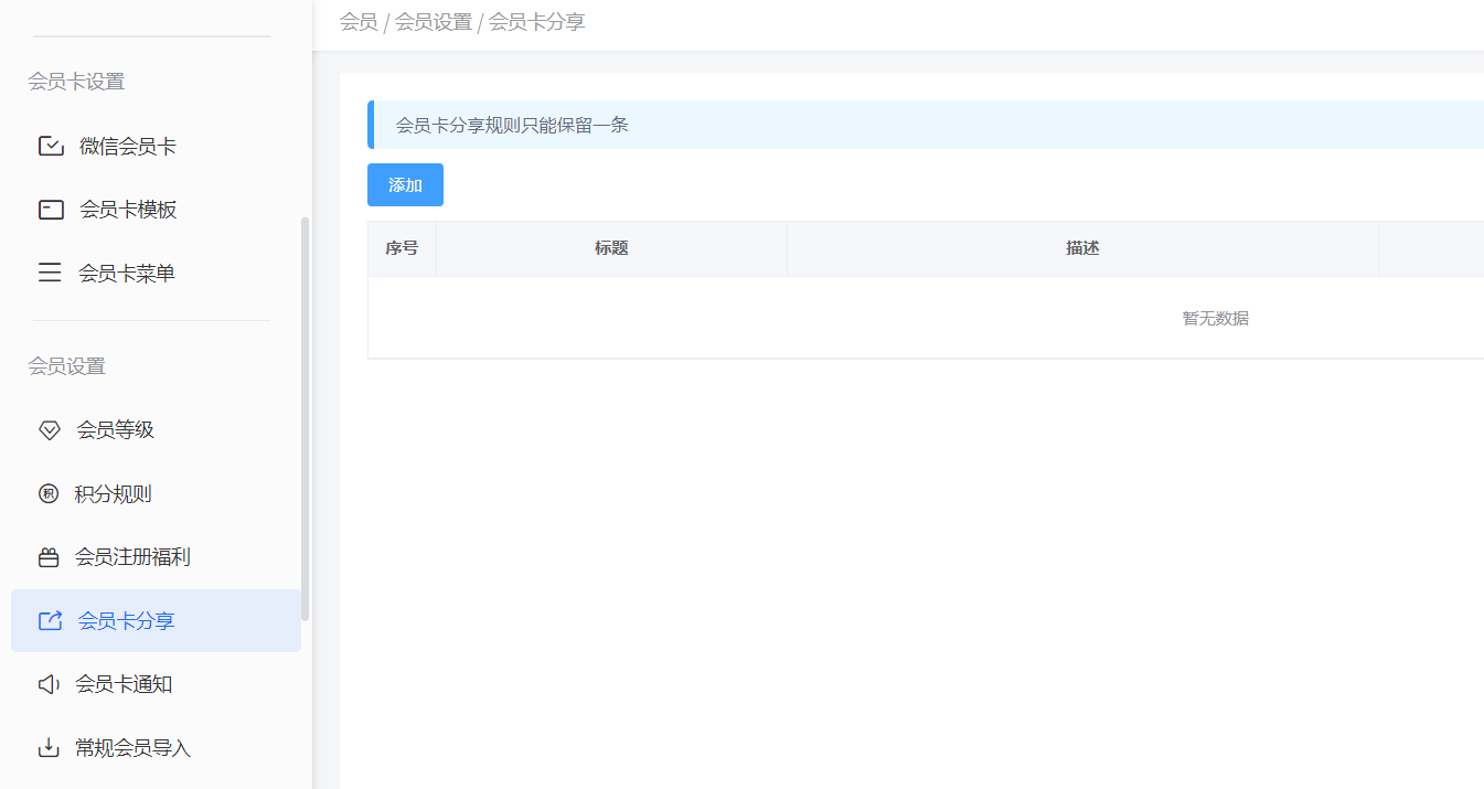 进入会员卡分享页面,点击添加——输入标题、描述、图片以及赠送的积分,具体设置后的手机界面