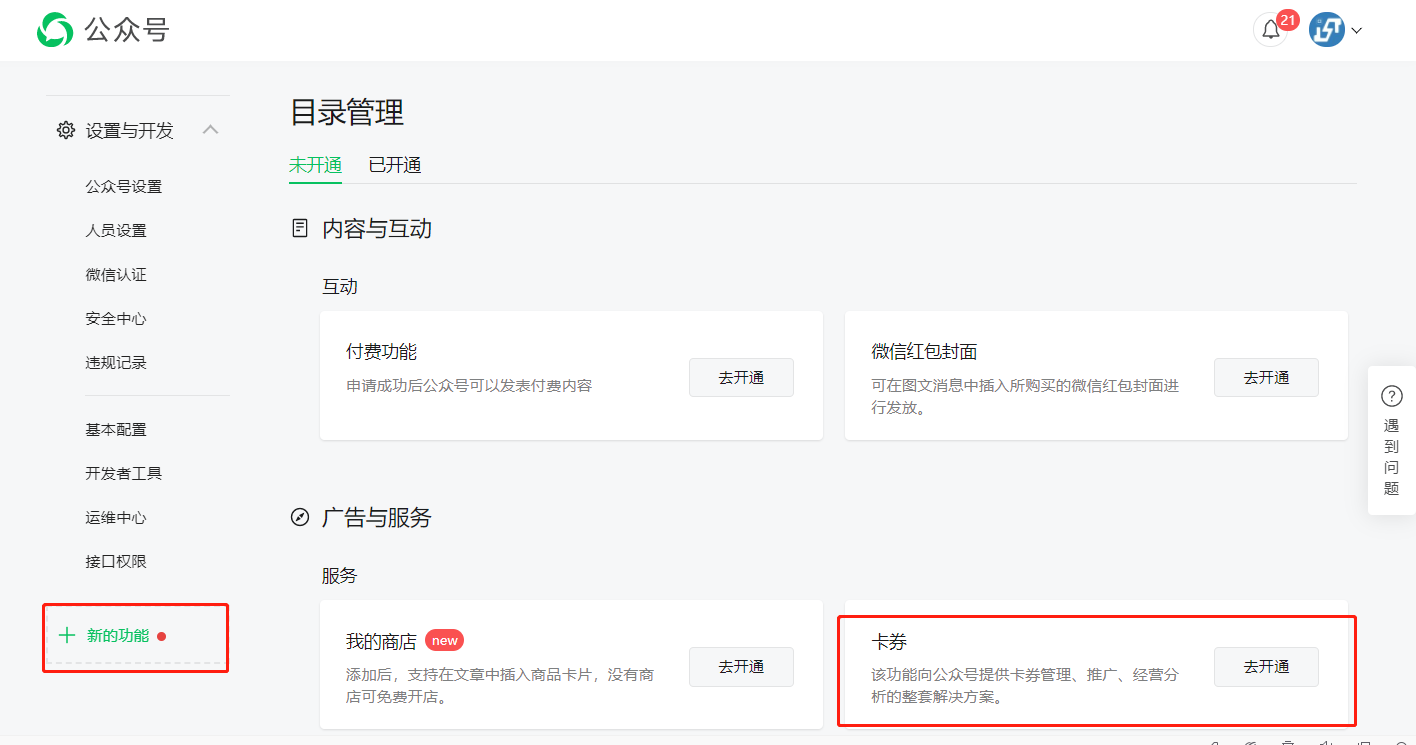 ## **二、公众号中开通卡券功能**