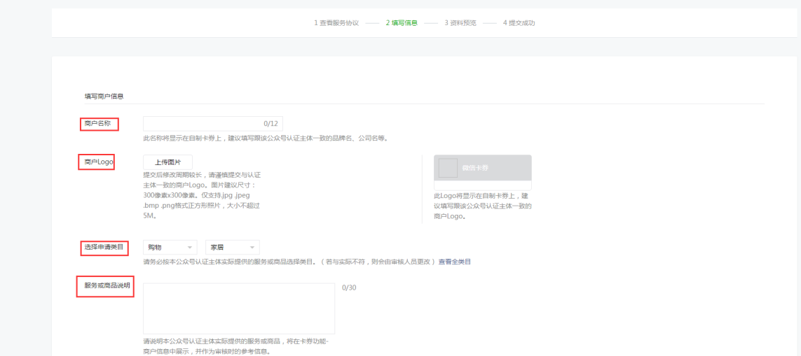 (2)填写信息:填写商户名称和服务或商品说明,上传商户logo并选择申请类目,填写完毕之后,点击下一步