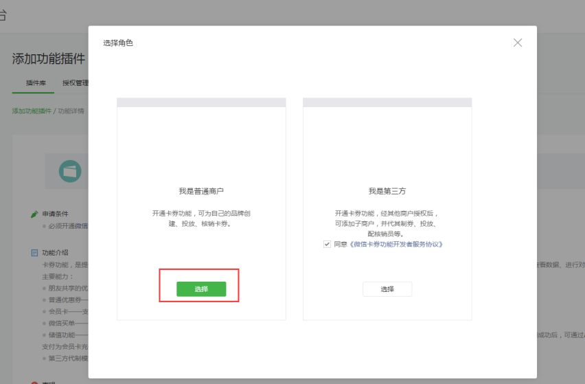 1、首先登陆网址https://mp.weixin.qq.com/,进入公众号,左侧功能里选择添加功能插件,选择卡券功能,点击开通,角色选择普通商户