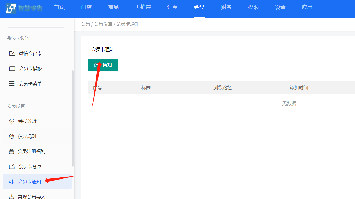 进入会员卡通知页面,点击新增,可以新增一个会员卡里面的通知——输入通知内容——选择通知类型。