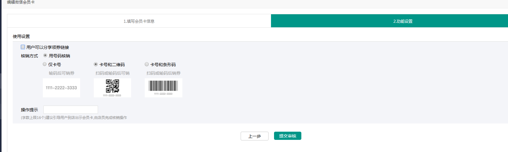 点击新增会员卡,建立新的会员卡,并进行会员卡信息设置——下一步——提交审核(注:商家使用会员卡的前提一定要先在这里创建会员卡)