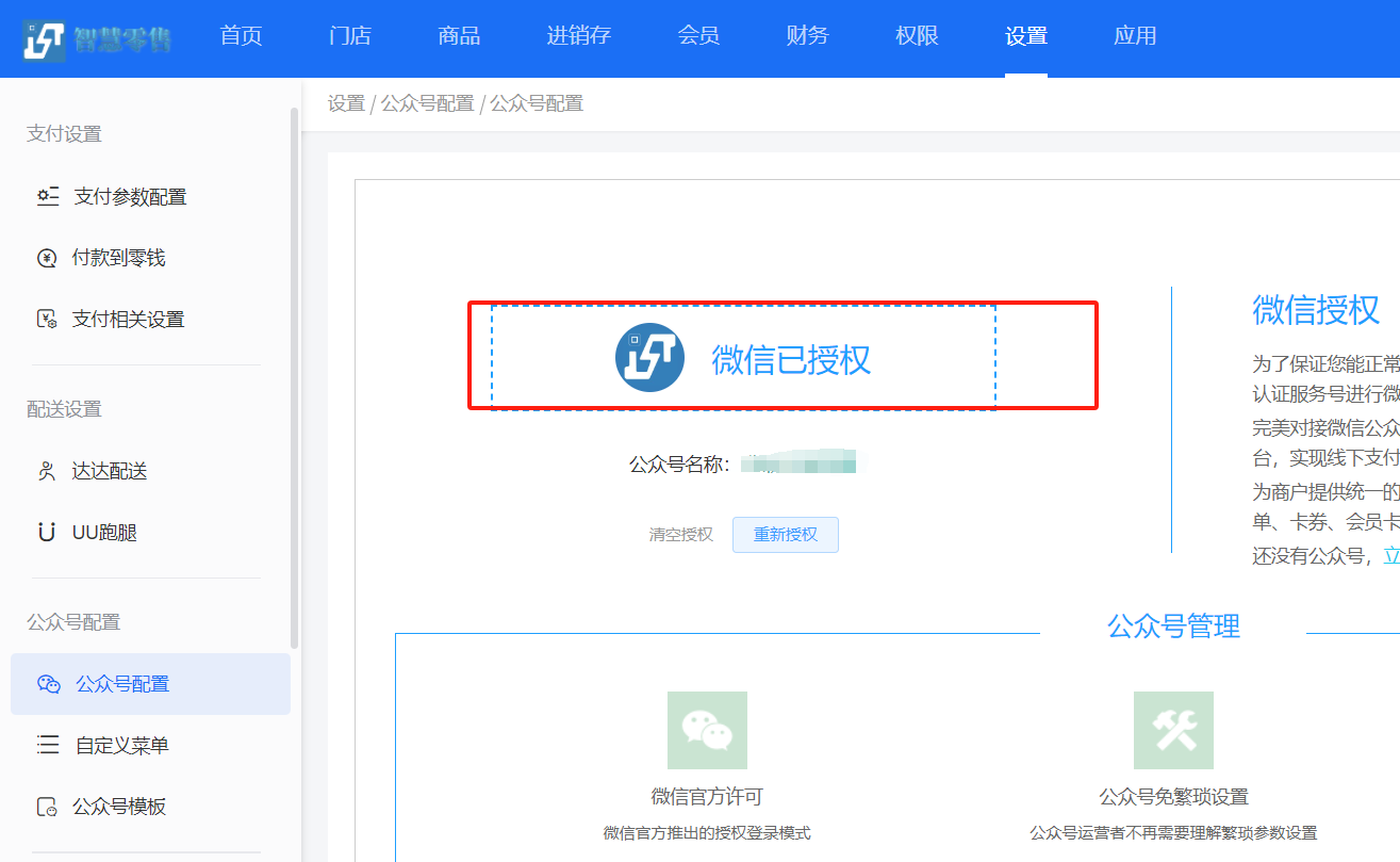 进入公众号配置页面,点击微信授权信息,商户使用公众号进行扫码授权(注:扫码授权的公众号必须是认证过的服务号,想要使用会员卡的前提是必须在商家后台先授权公众号)