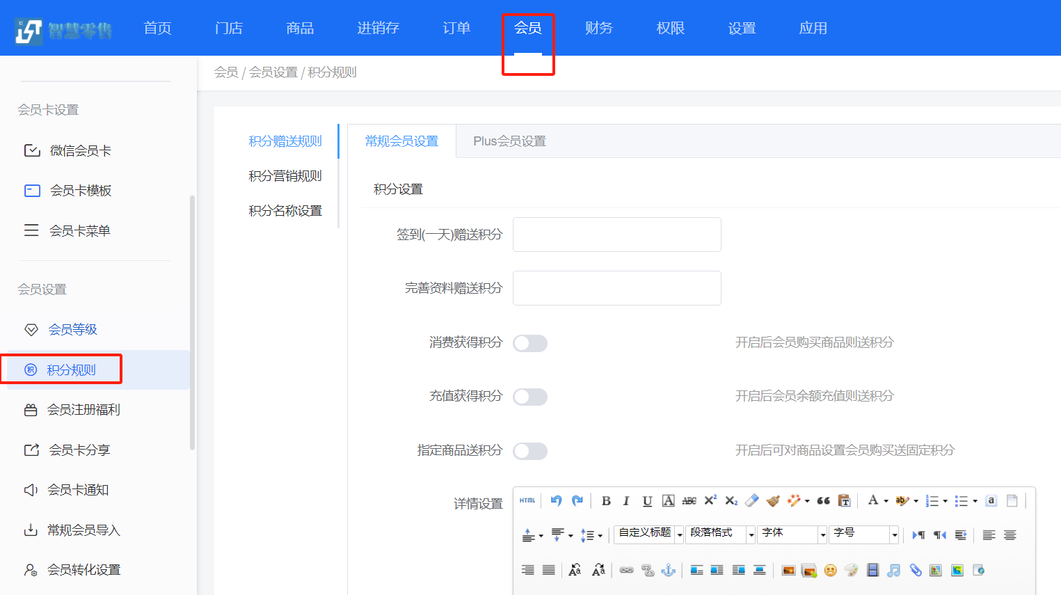 1、进入积分规则页面,可设置常规会员和Plus会员签到是否送积分、完善资料送是否送积分、消费和充值是否赠送积分