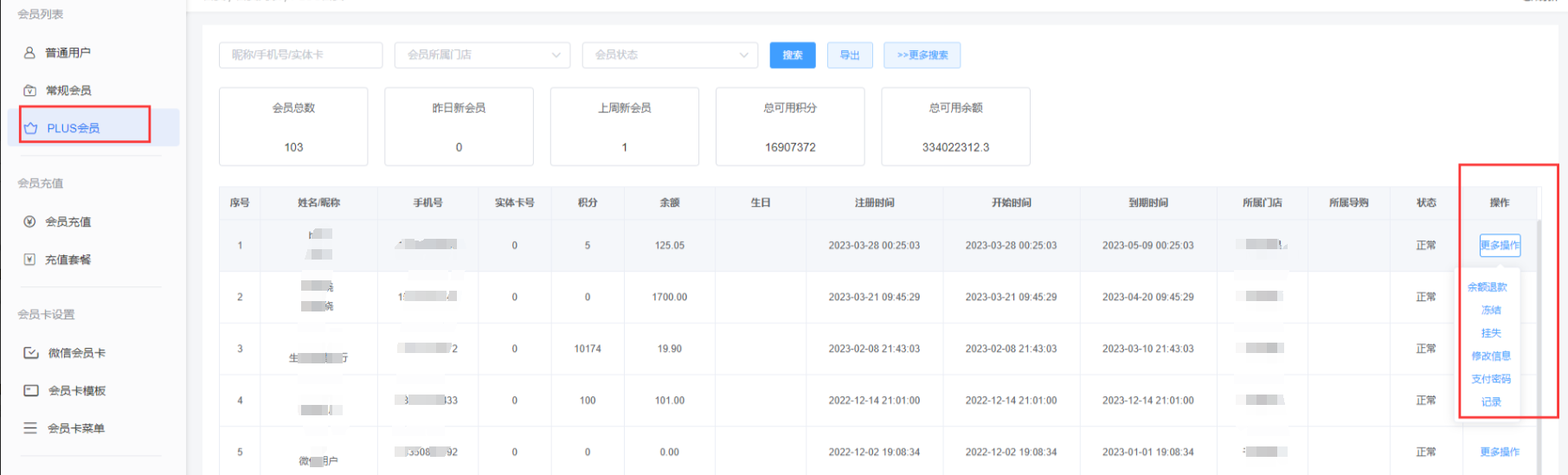 1、商户在此页面修改plus会员信息,余额退款、挂失和修改会员密码