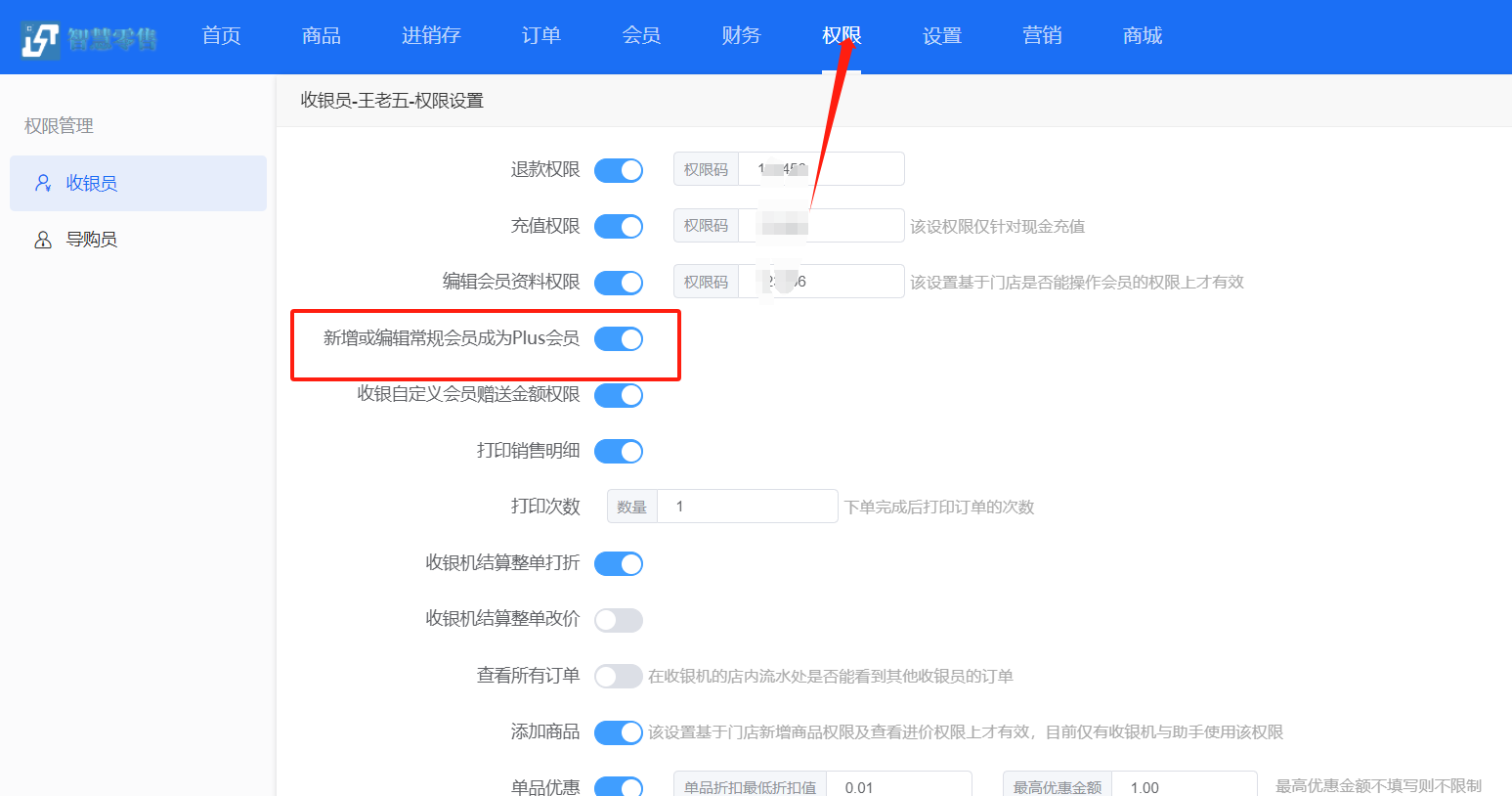 后台设置的Plus套餐只针对线上,线下的话,店长给收银员开启新增和编辑Plus会员的权限,客户把钱给收银员,收银员手动添加就可以了
