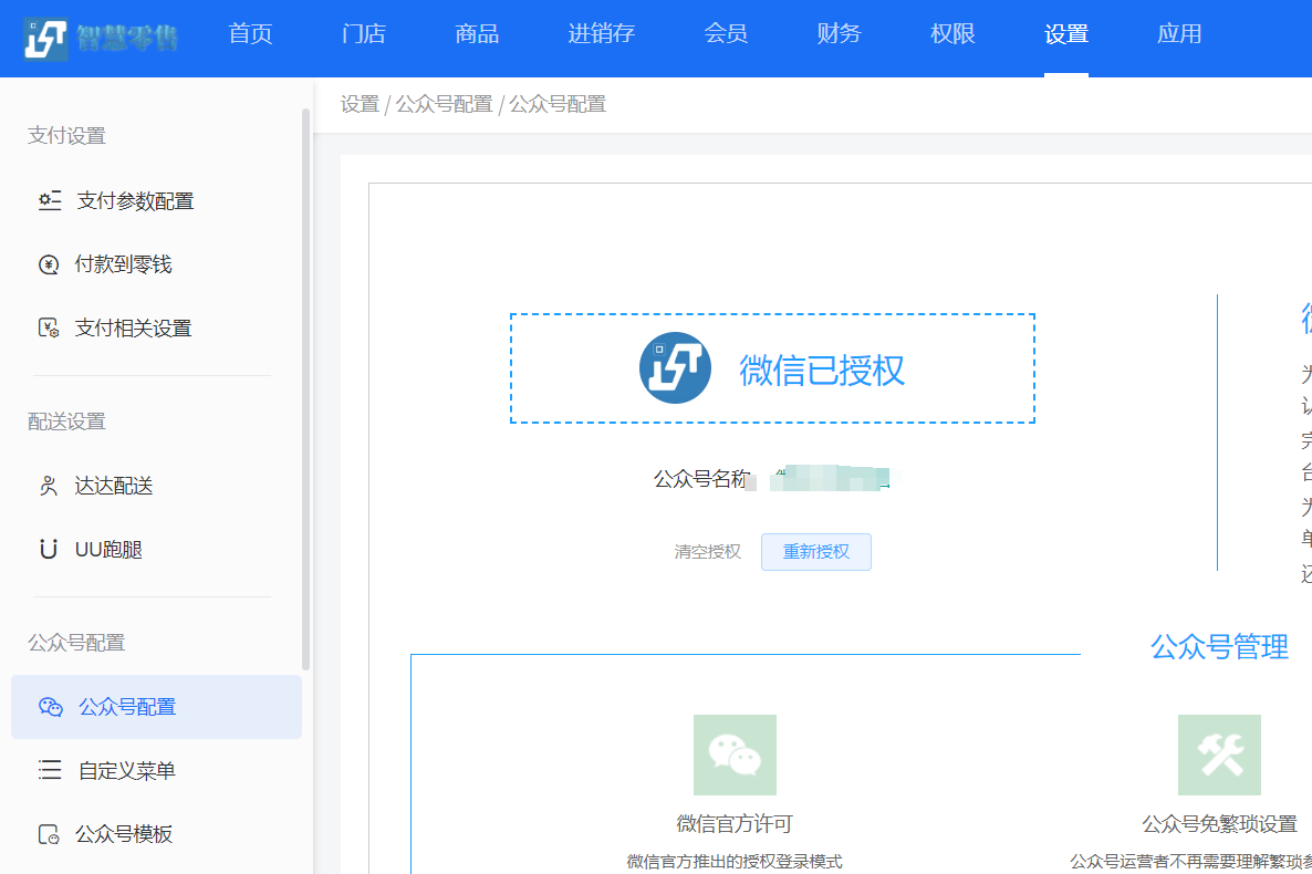 进入公众号配置页面,点击微信授权信息,商户使用公众号进行扫码授权(注:扫码授权的公众号必须是认证过的服务号,想要使用会员卡的前提是必须在商家后台先授权公众号)