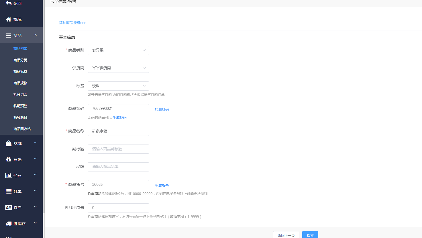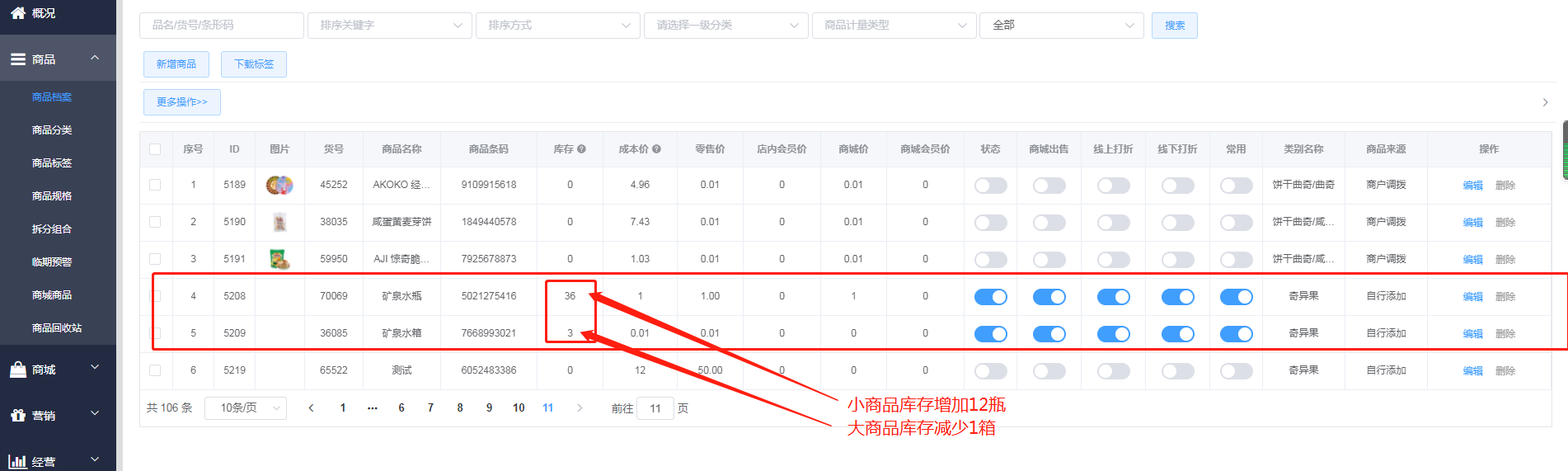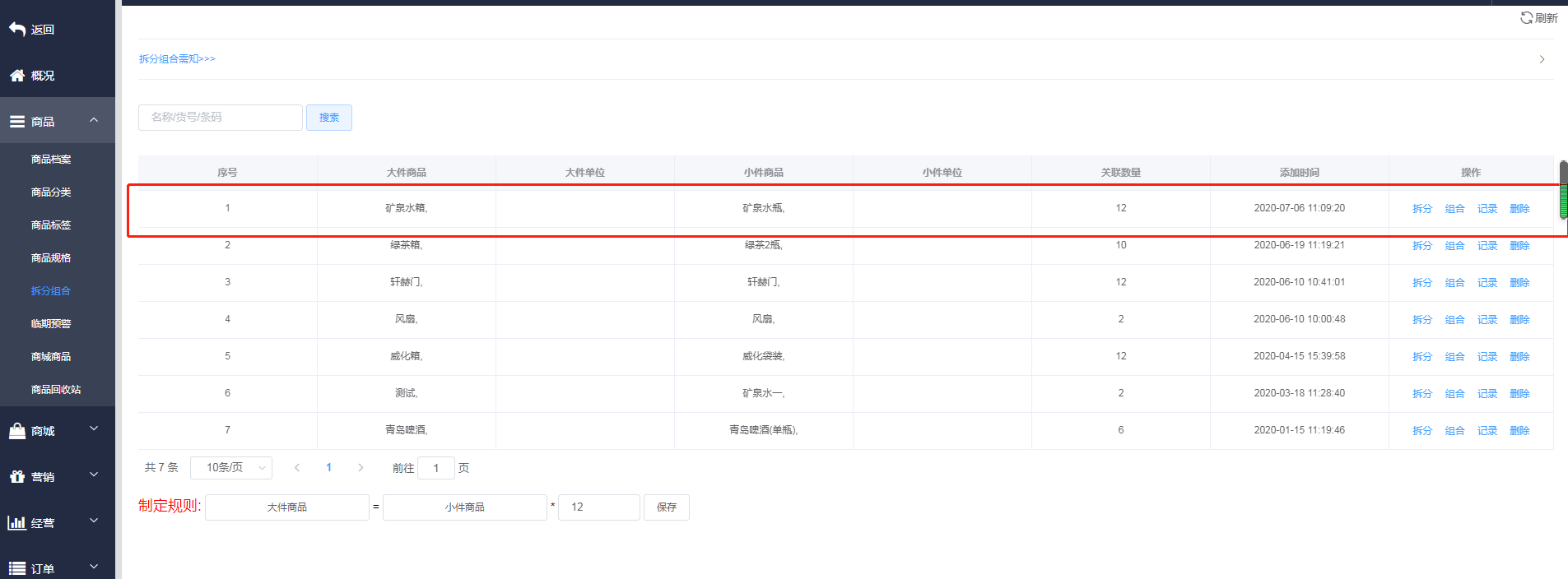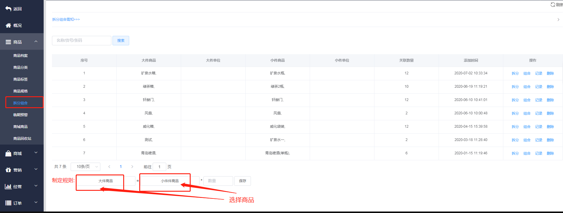 1\. 请先制定大件商品与小件商品的规则(例如大件商品选择矿泉水整箱,小件商品选择矿泉水,规则数量填写关联数量24:一箱矿泉水由24瓶矿泉水组成)